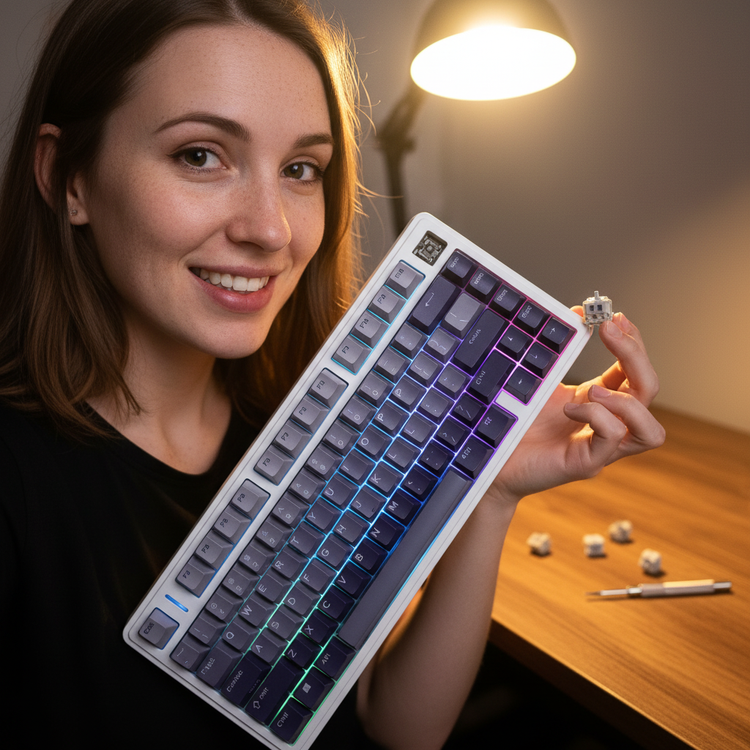 The F75 Pro supports 3-pin and 5-pin mechanical switches, allowing you to swap in tactiles, linears, or clickies without soldering.