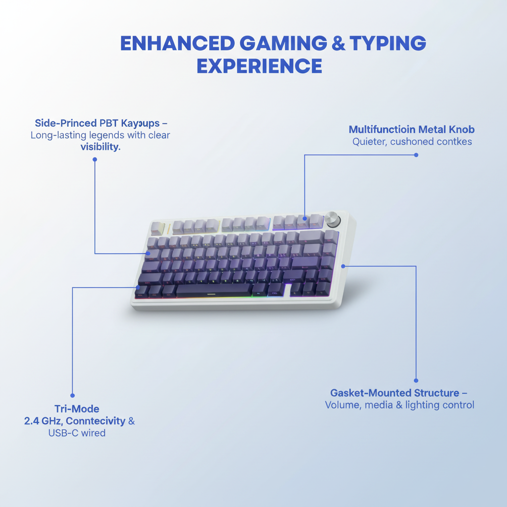 • 75% compact 81-key layout for maximum desk space • Side-printed PBT keycaps resist wear and shine • Gasket-mounted with IXPE, Poron & silicone dampeners • Pre-lubed switches and stabilizers for silky-smooth typing